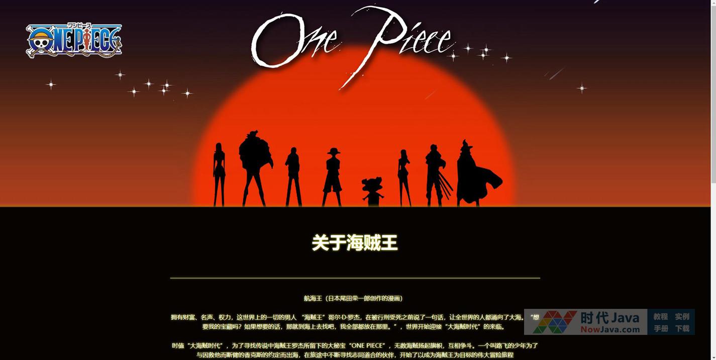 这是一款基于html5+jQuery实现的海贼王单页视差滚动特效源码,是一款流行滑落网页特效代码。鼠标滑过背景星空可看到星空的滑动效果,且背景带有流星雨的特效。滚动到页面底部可见《海贼王》人物的滚动介绍。整体效果华丽大气,是一款非常优秀的特效源码。