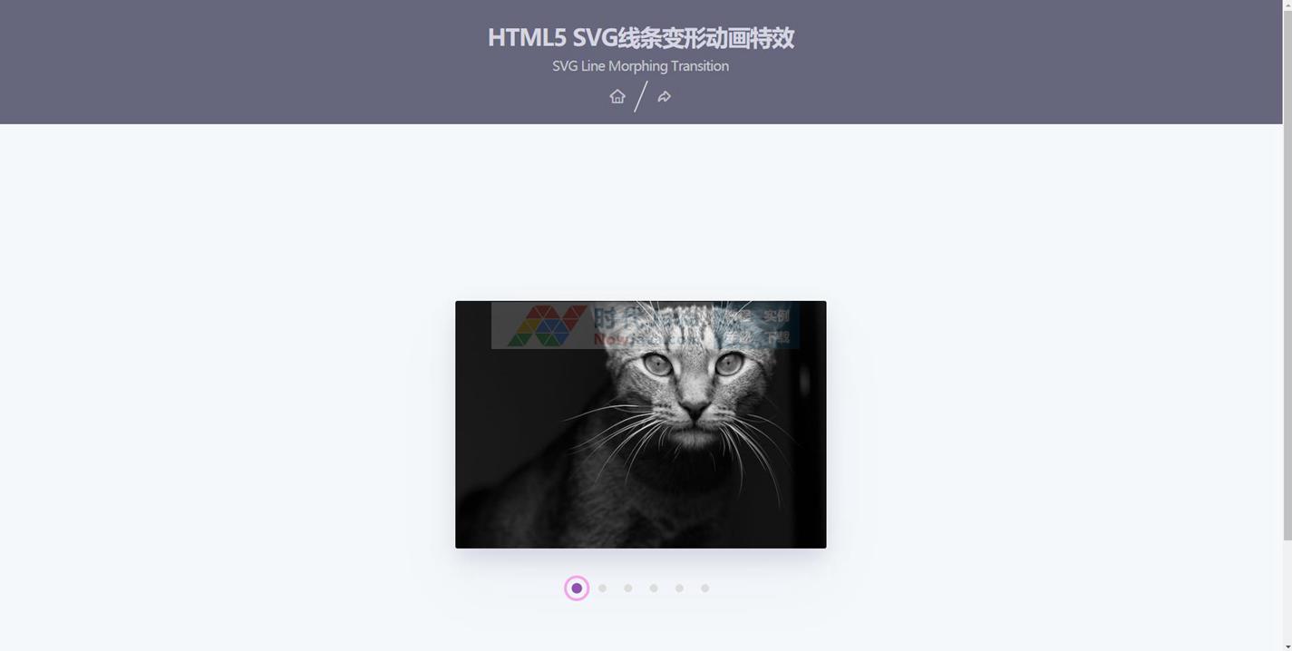 这是一款HTML5 SVG线条变形动画特效。这个特效demo是一个轮播图分页导航的例子,在每个分页圆点上都有一个SVG圆形线条,当用户点击其它圆点时,圆形线条以平滑过渡的方式运动到下一个位置。