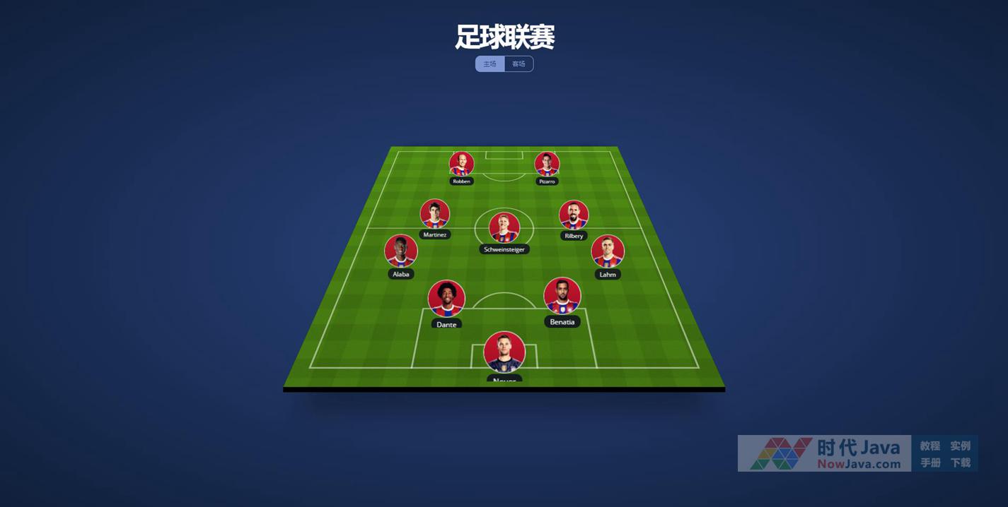 html5 css3绘制3D足球比赛队员位置分布图特效源码,分为主场和客场,支持3D旋转切换队员对战分布图。本段代码可以在各个网页使用,有需要的朋友可以直接下载使用,本段代码兼容目前最新的各类主流浏览器,是一款非常优秀的特效源码!