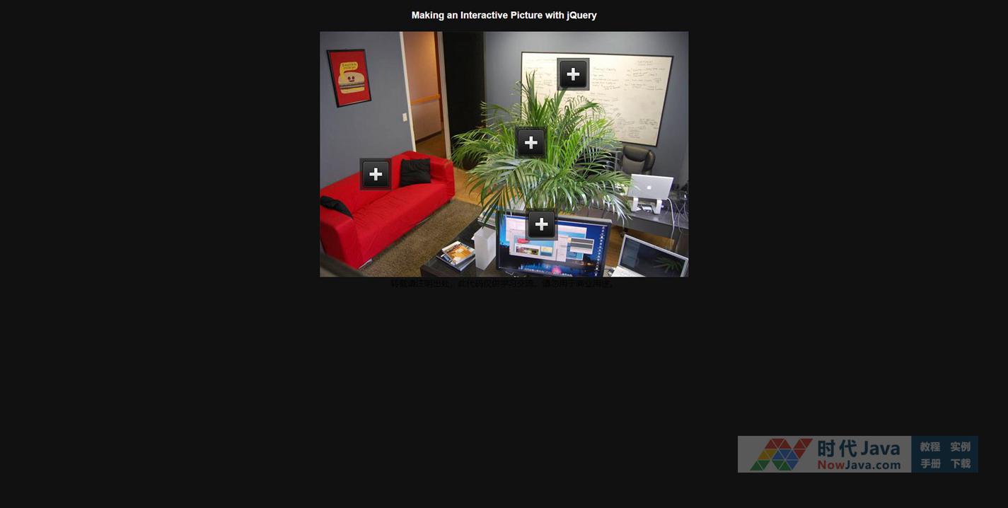 一个jQuery实现的图片热点效果,可以在图片的任意地方定义热点,点击后弹出一个浮动框显示该热点的详细信息,弹出框可以包含图片、文本、html代码等,经测试效果相当不错,建议学习jquery的朋友下载