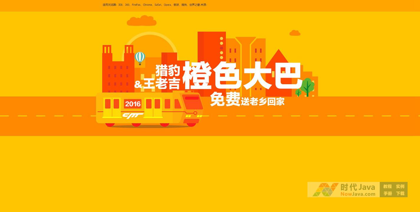 是一款基于jQuery+CSS3实现的猎豹橙色大巴2016免费送老乡回家过年页面动态特效页面。需要此款代码的朋友们可以前来下载使用。本段代码兼容目前最新的各类主流浏览器,是一款非常优秀的特效源码。
