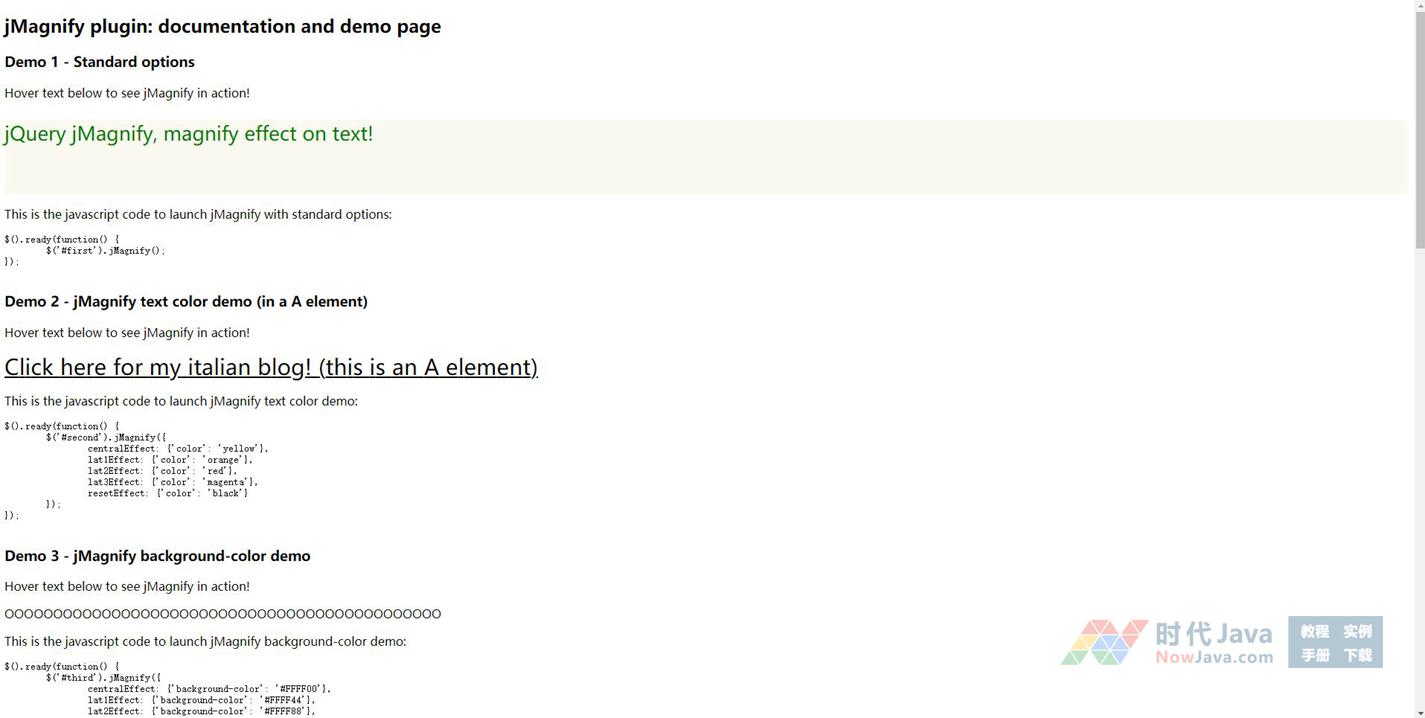 一个jQuery文字突出展示特效插件jquery.jMagnify.js,通过此插件可以很容易的实现鼠标滑过文字时的特殊效果,例如放大、变色等等,经测试效果相当不错,感兴趣的朋友可以下载学习使用哈