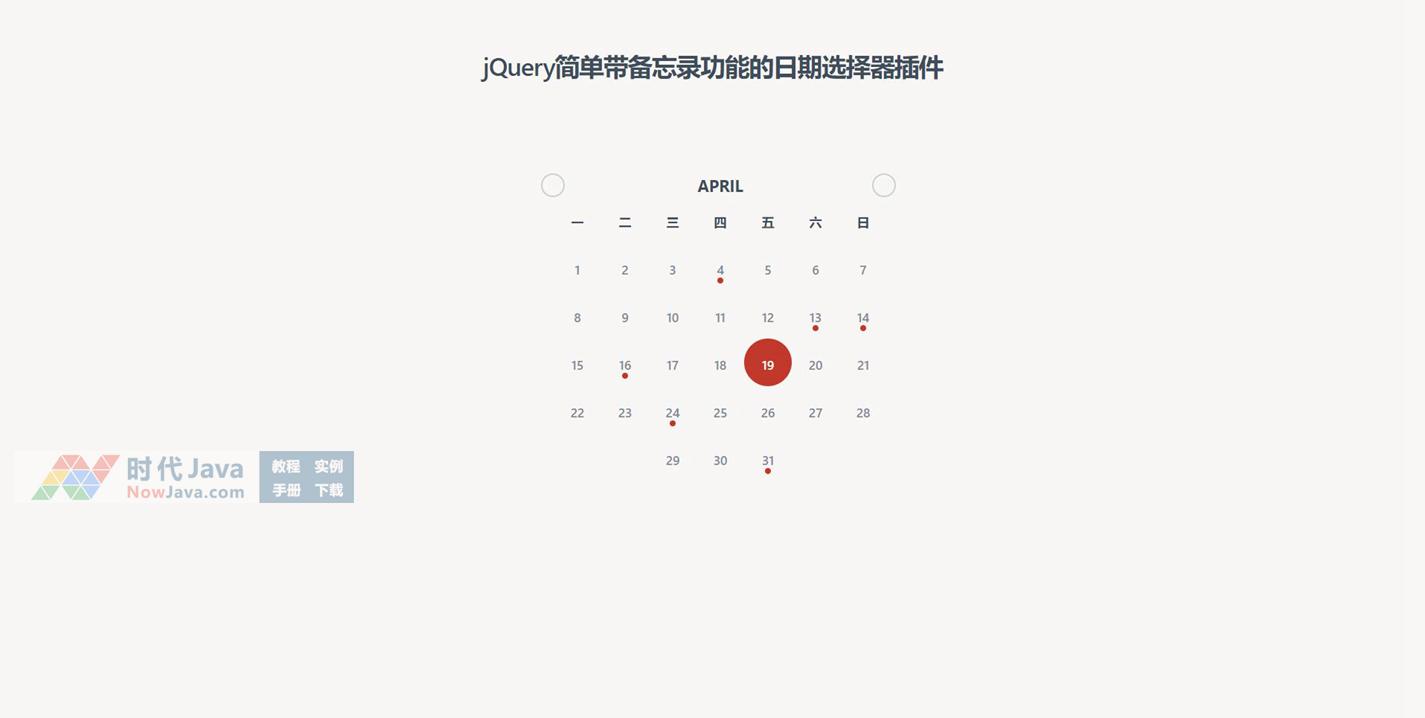 jQuery带备忘录功能的日期选择器是一款带备忘录功能的简单的jQuery日期选择器插件,你可以为该日期选择器的某些日期设定设定一些信息,方便日常查询,就像现实生活中的备忘录一样,建议用户使用支持css3与HTML5效果较好的火狐或谷歌等浏览器预览本源码。