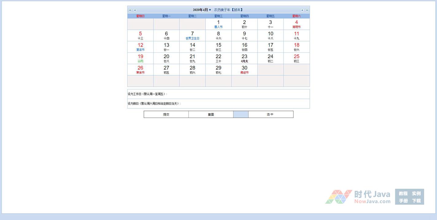 这是一款基于jquery实现带农历的节假日与工作日设置功能日历源码。带有基本的日历年份、月份选择功能,并显示相应日期的农历与节日(默认显示当前月份)。用户还可点击选择假日与工作日(默认周一至周五为工作日,周六与周日为假日)。非常方便实用。该源码兼容目前最新的各类主流浏览器。