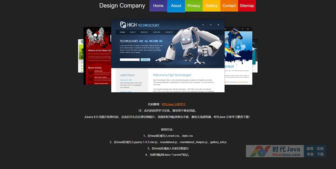 这是一款基于jQuery实现的卡片式图片轮换特效源码,点击后可左右任意切换图片,顶部彩虹导航效果也不错,可兼容目前最新的各类主流浏览器,是一款非常优秀的特效源码。