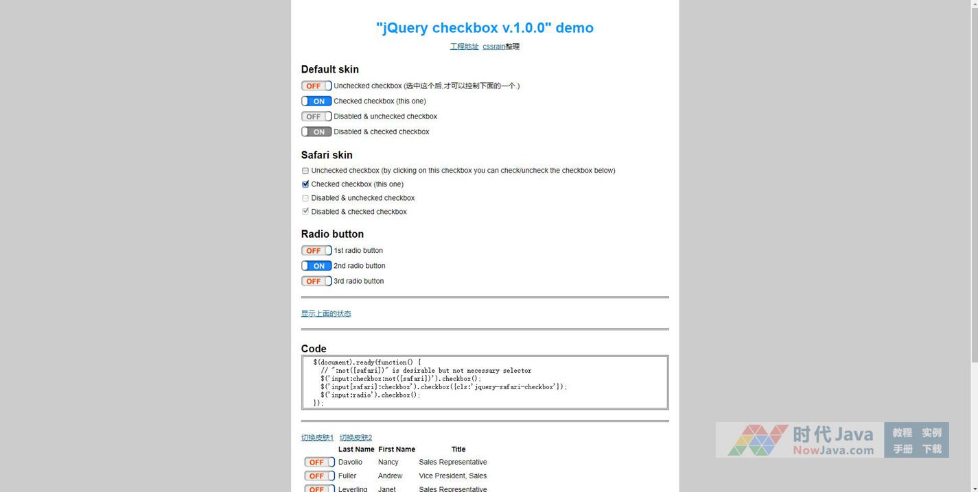 jQuery Checkboxes插件是基于jQuery的Checkbox精美样式插件,支持jQuery多个版本,极具动感的鼠标反馈,提供有两种样式。本样式把传统的Checkbox变为了左右拨动的形式,鼠标只需点击一下即可改变状态。 在线演示地址://nowjava.com