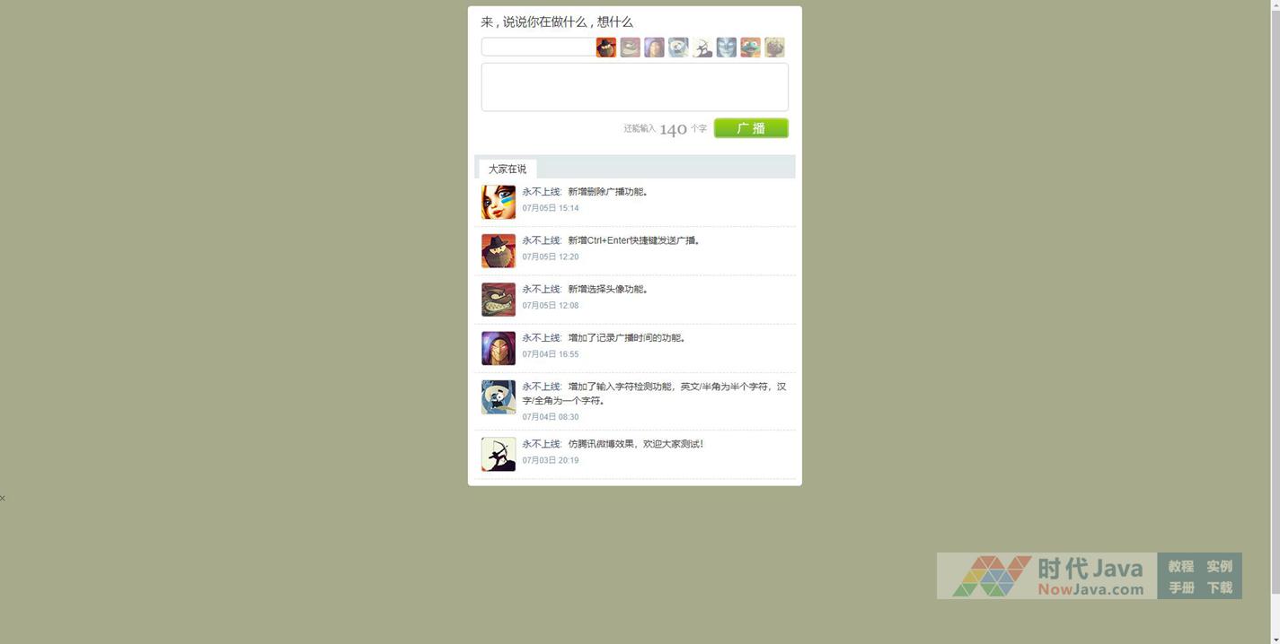 是一款类似新浪微博广播留言板JS特效代码。本段代码适应于所有网页使用,有兴趣的朋友们可以前来下载使用。本段代码兼容目前最新的各类主流浏览器,是一款非常优秀的特效源码。