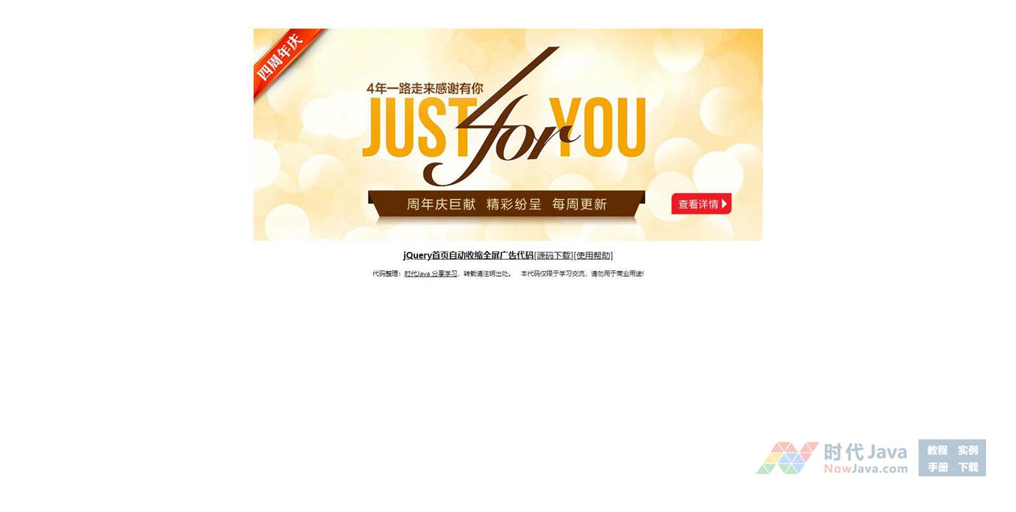 一款基于jQuery框架的宽屏广告代码,可以自动收缩展开全屏广告,颇似门户网站常用的泰山压顶式的flash广告,代码很简单,可应用于网站首页。