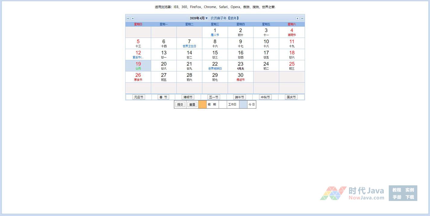 这是一款基于Jquery实现的万年历日期时间代码,可实现的万年历的农历查询及节假日期时间显示等功能。是一款非常优秀的特效源码,有着非常广泛的应用空间。该源码兼容目前最新的各类主流浏览器。