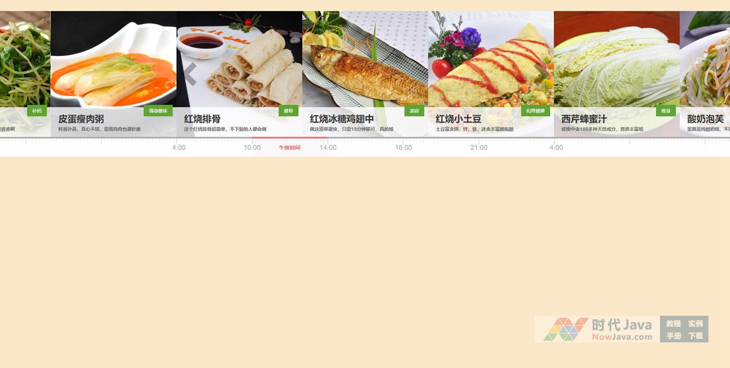 这是一款基于jQuery实现的美食网站带时间轴的宽屏焦点图切换源码。底部的时间轴标注位置随着幻灯片的移动而移动,左右切换按钮也会随着时间轴位置的改变而变换显示的对应时间段,幻灯片可以通过点击左右切换按钮进行切换,也可自动切换。是一款非常个性化的幻灯片源码。该源码兼容目前最新的各类主流浏览器。