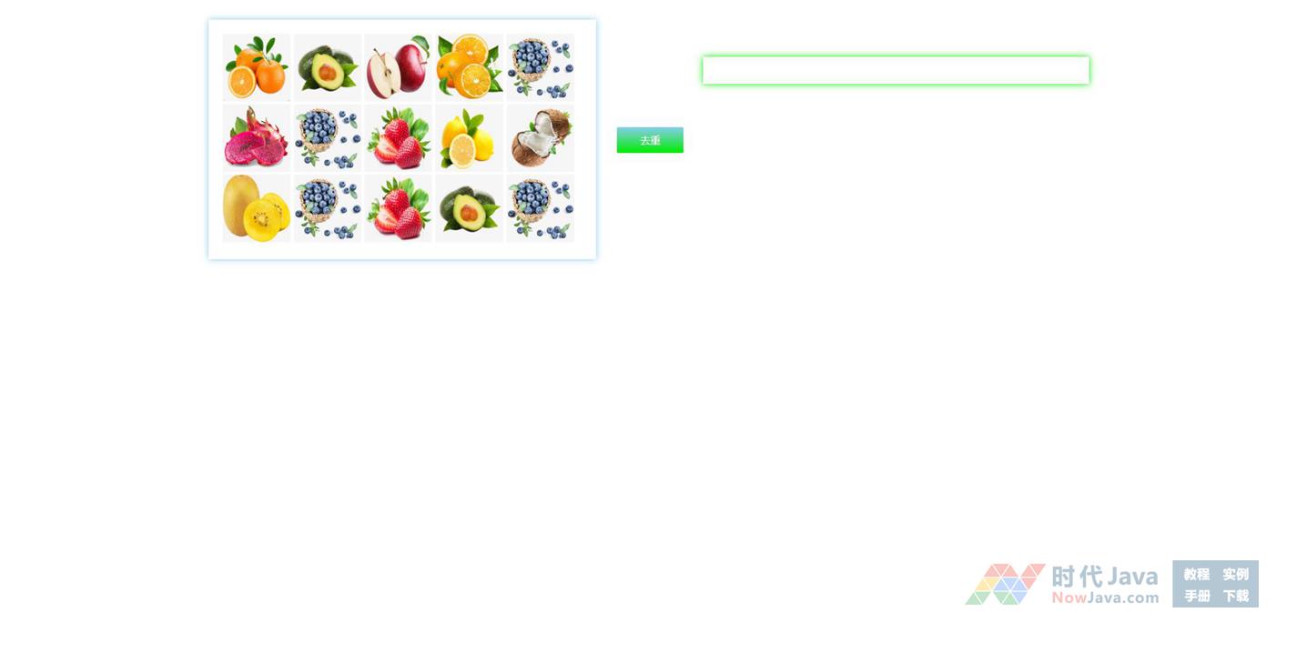 这是一款基于jQuery实现的水果图片重复筛选去除功能源码。左侧有若干带重复的水果图片排列显示,点击筛选按钮则右侧就会出现筛选去重复之后的图片列表。该源码兼容目前最新的各类主流浏览器。