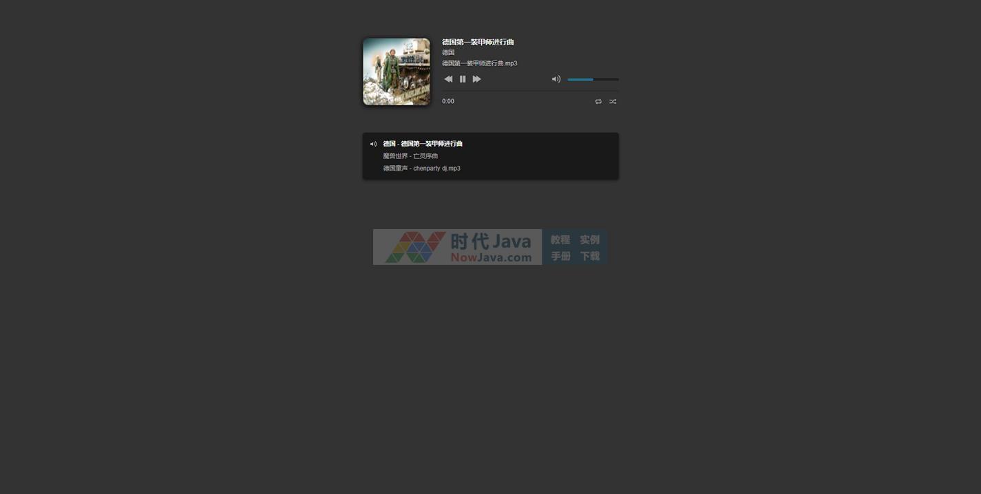 这是一款基于Jquery+html5实现的网页播放器代码,是一款html5黑色音频播放器样式代码。具有完整的播放、暂停与切换歌曲等功能,以及调节音量和现实播放进度。建议采用支持HTML5的谷歌或火狐等浏览器运行该源码。