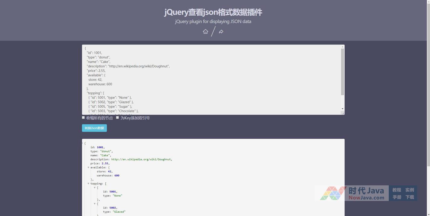 jquery.json-viewer.js是一款查看json格式数据的jquery插件。它可以将混乱的json数据漂亮的方式展示在页面中,并支持节点的伸展和收缩和语法高亮等功能。需要的朋友可以下载,本段代码兼容目前最新的各类主流浏览器,适用浏览器:搜狗、360、FireFox、Chrome、Safari、Opera、傲游、世界之窗,不支持IE8及以下浏览器,首选火狐浏览器。是一款不错的的特效插件,希望大家喜欢!