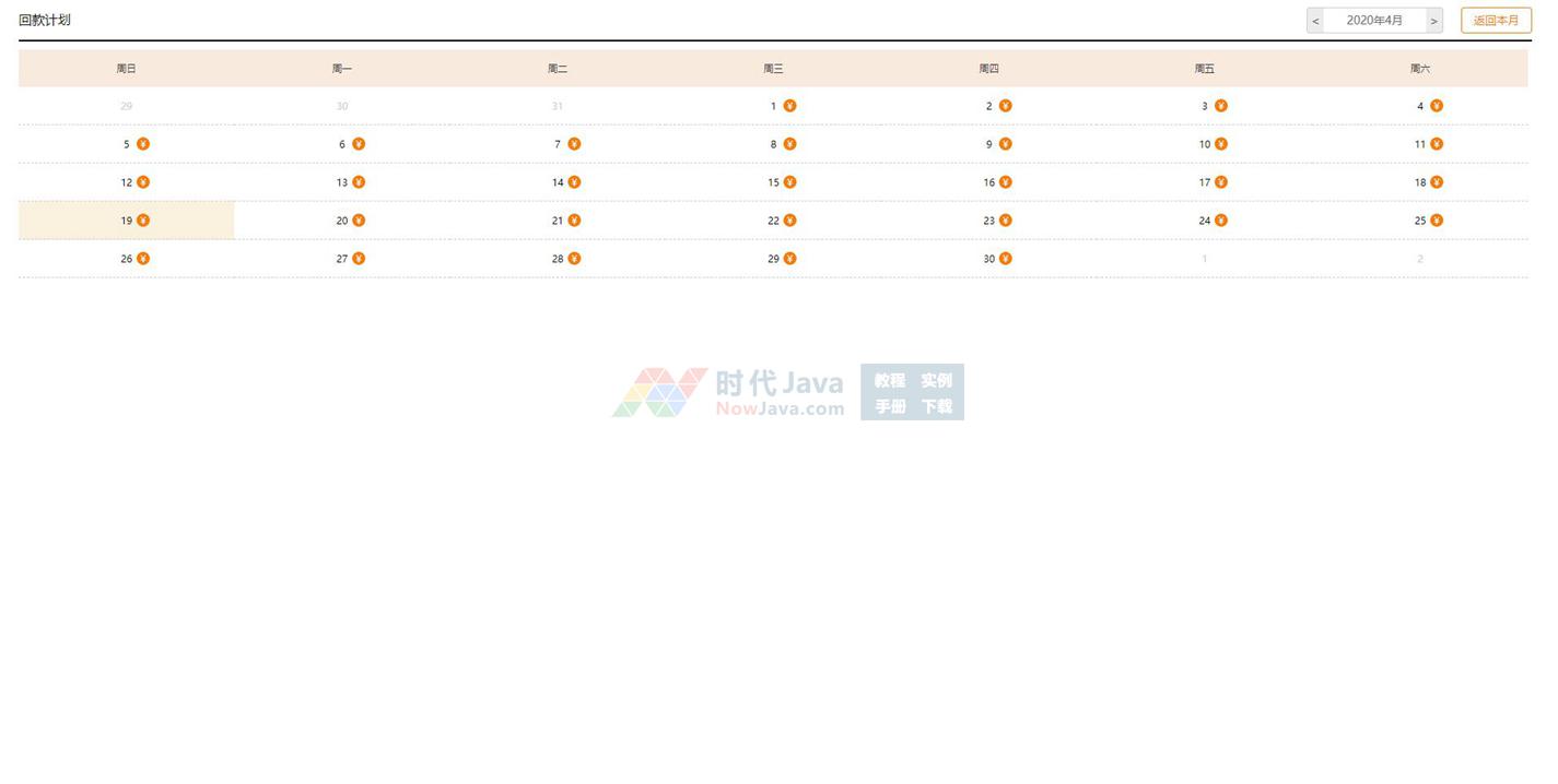 这是一款基于jQuery实现的自适应屏幕回款计划日历表功能源码,日历可根据屏幕的宽高自动调整大小,用户可选择想查看的月份并带有返回本月的功能。鼠标滑过具体日期可显示回款计划提示框。该源码可兼容目前最新的各类主流浏览器。