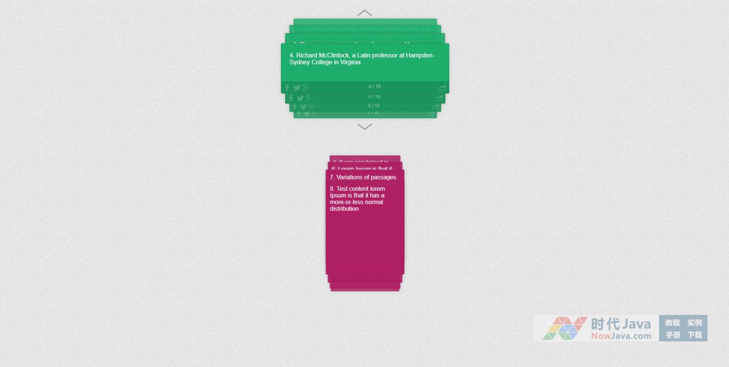 这是一款很有创意的jQuery内容滚动切换特效插件,我们可以设置任意数量的文字层,让其层叠在一起,然后点击按钮让其出现层叠滚动切换的效果,当然,它也支持自动滚动切换,另外,你也可以自己设置滚动切换的速度。