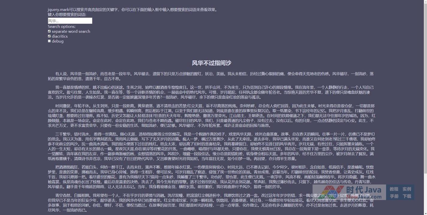 jQuery.Mark插件实现搜索高亮显示文本关键字特效源码是一款支持变音符号,同义词,自定义元素,自定义class名称,单词边界和iframe。它可以通过搜索的方式来高亮所有的指定关键字。