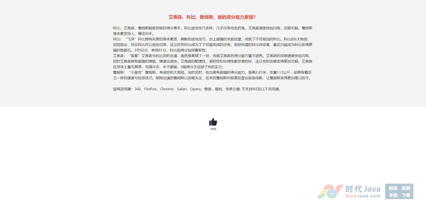 jQuery+CSS3实现的文章大拇指点赞功能特效源码是一段实现了在文章底部出现的大拇指点赞图标,并点击大拇指后会出现+1的点赞特效代码,且该大拇指下方还有明确的点赞数量,支持点赞加一跟取消点赞减一特效,本段代码适应于所有网页使用,有需要的朋友们就来下载使用吧。本段代码兼容目前最新的各类主流浏览器,是一款非常优秀的特效源码。