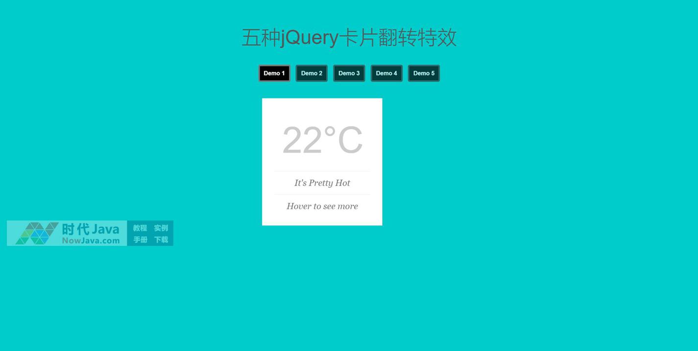 jQuery结合CSS3实现的五种鼠标悬停卡片翻转特效源码是一段实现了五种当鼠标放置的卡片位置上时,该卡片会向上下左右四个方向进行3D翻转延伸出更多内容的效果代码,非常有意思,本段代码适应于所有网页使用,有需要的朋友们可以前来下载使用。本段代码兼容目前最新的各类主流浏览器,是一款非常优秀的特效源码。
