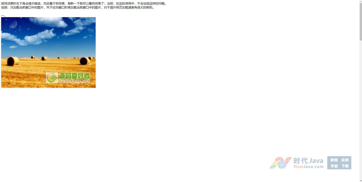 jQuery 图片即时加载技术,也就是用时候再加载的一个演示实例,这样可提高网络带宽资源利用率,避免加载不需要的资源,以战胜网络带宽。再此提示一下,如果直接双击页面预览的话,网页左下角会提示错误,而且看不到效果,这时候刷新一下网页就可以了;在实际使用中,不会出现这样的问题。