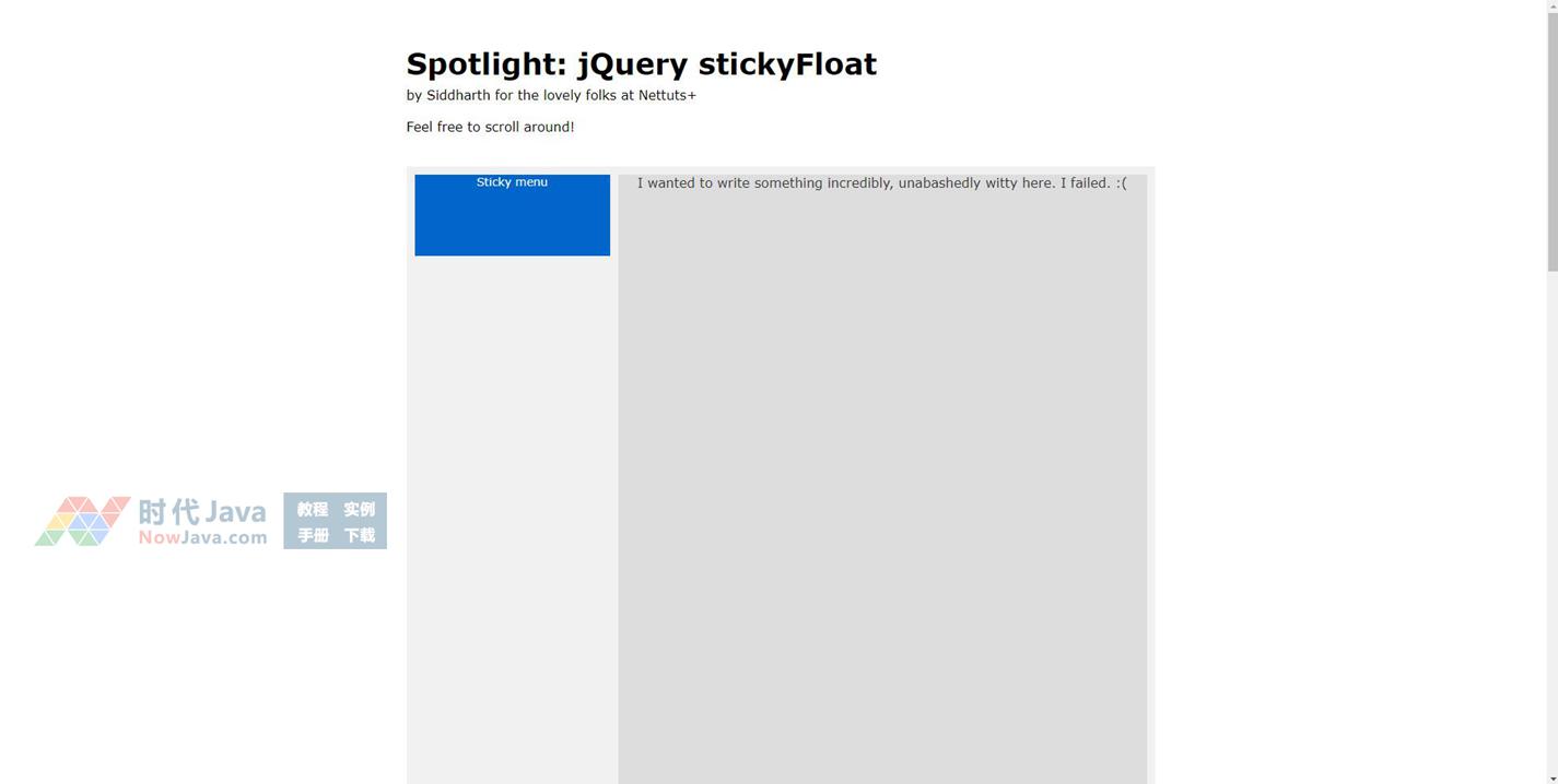 Spotlight: jQuery stickyFloat——jQuery动画回到顶部示例,上部的一个DIV在jQuery的控制下会动画缓冲移动到原始的位置,不管你如何拉动滚动条,它始终会显示在最初的顶部,通过本例你可学习一下jQuery的动画生成原理,对于你的前端编程意义重大,喜欢的朋友可以试试看。