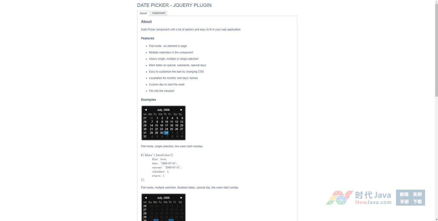 不一样的jQuery日历组件,datepicker与jQuery的完美配合,可以多种方式调用日历,一次可以单个显示,也可以多个连续显示,如上图示。自带的示例文件相信可以满足你的一般性需求,另外还有使用文档,E文好的借鉴一下。