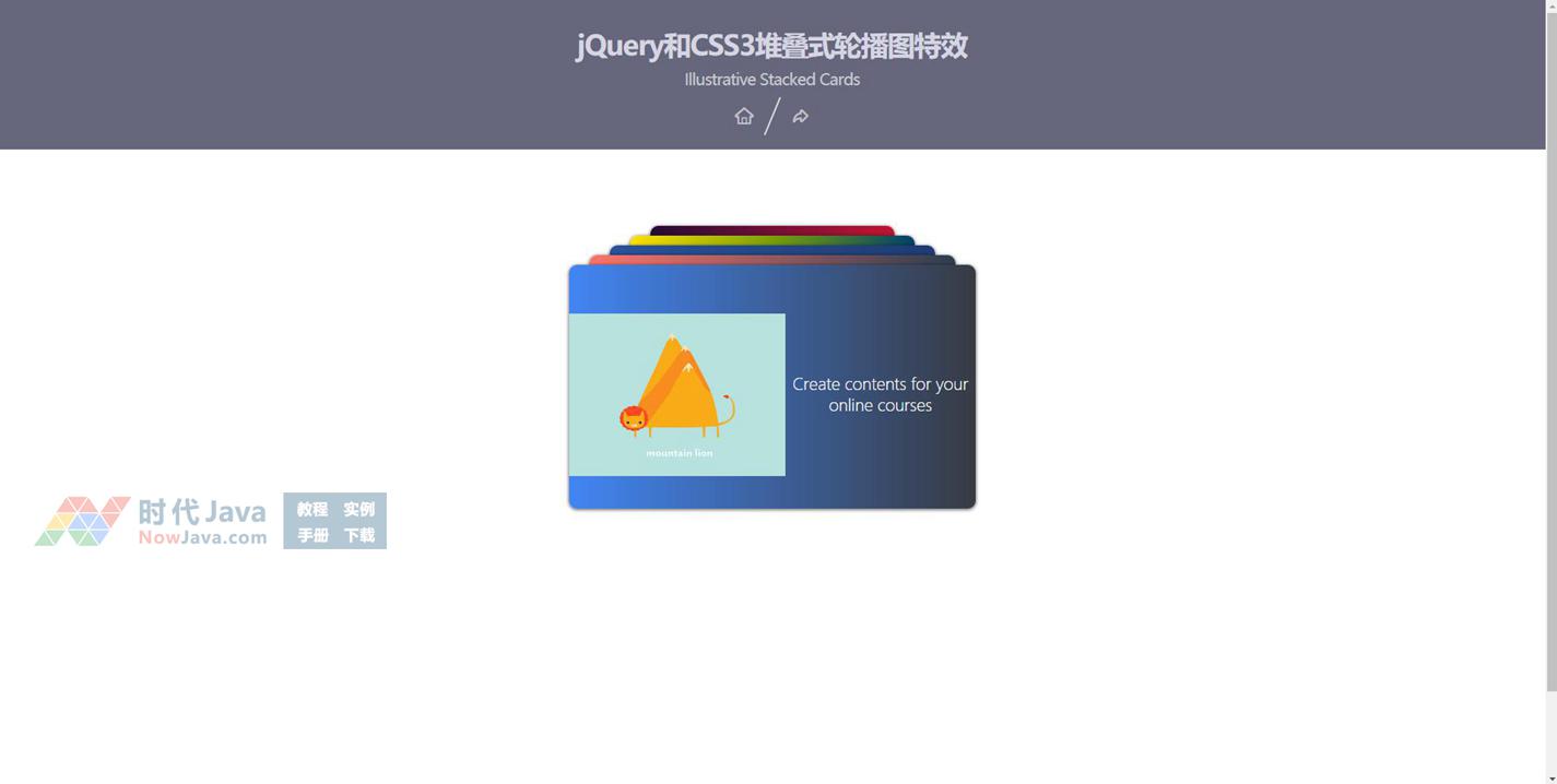这是一个实现jQuery和CSS3堆叠式轮播图特效。该轮播图可通过css将图片堆叠到一起,然后通过jquery代码来控制在切换时,不断的显示下一张图片实现轮播特效。简单实用,欢迎下载!代码适用浏览器:搜狗、360、FireFox(建议)、Chrome、Safari、Opera、傲游、世界之窗,是一款不错的的特效插件,需要的朋友可以下载!希望大家喜欢!
