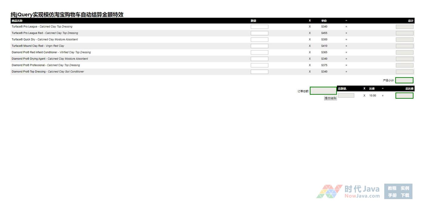 纯jQuery实现模仿淘宝购物车自动结算金额效果,可根据商品单位和用户选购数量自动计算商品总值,适时计算,ajax 方式,用户修改产品时,最终的计算结果也会发生变化,适合用于在线购物一类的网站使用的网页特效