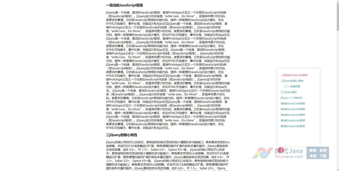 jQuery文章目录索引导航菜单特效源码是一款点击导航锚点页面滚动到相应的文章内容效果代码。本段代码可以在各个网页使用,有需要的朋友可以直接下载使用,本段代码兼容目前最新的各类主流浏览器,是一款非常优秀的特效源码!