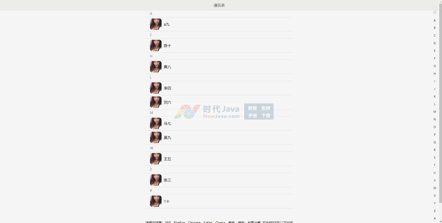 jQuery实现的仿iPhone通讯录首字母检索特效源码是一款实现了仿苹果通讯录首字母检索功能的效果代码,与iPhone手机通讯录检索功能几乎一模一样,本段代码适应于所有网页使用,有兴趣的朋友们可以前来下载使用。本段代码兼容目前最新的各类主流浏览器,是一款非常优秀的特效源码。