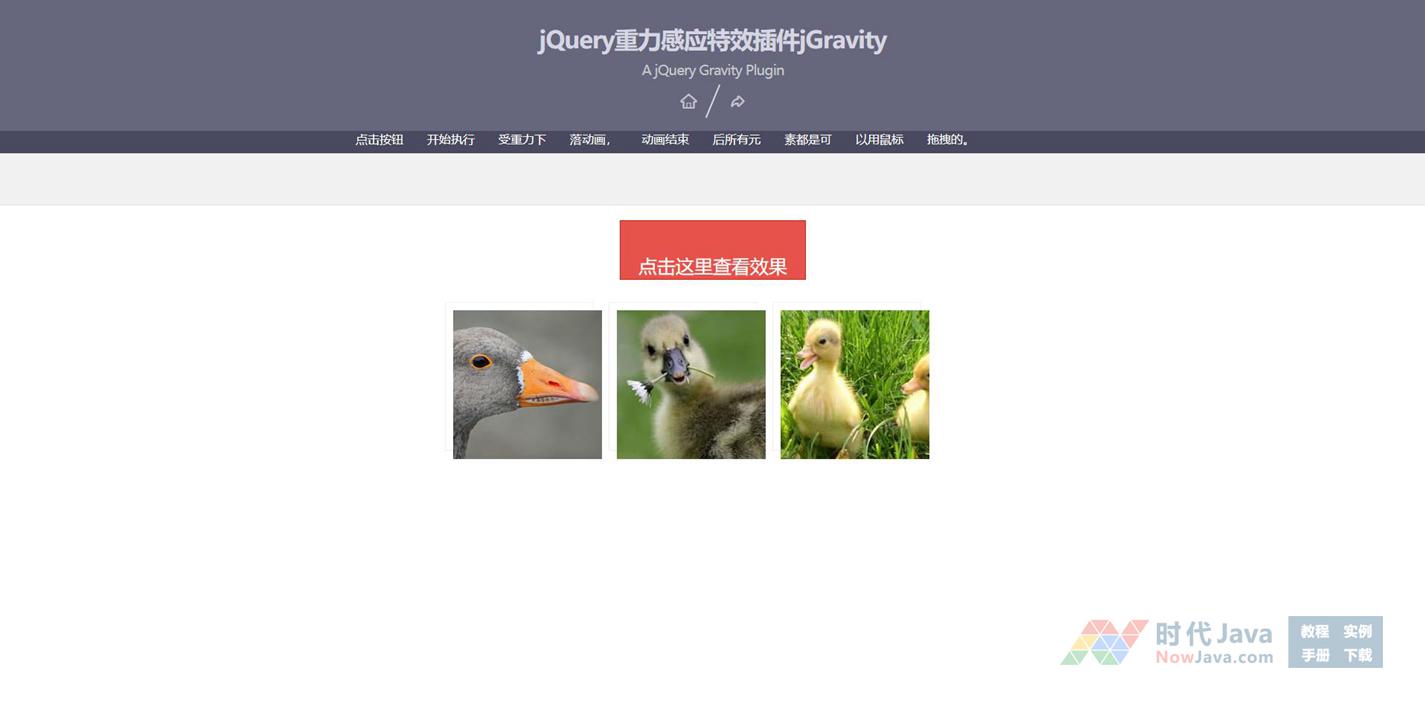 这是一款jQuery重力感应特效插件jGravity。该jQuery重力感应插件可以为页面中的所有元素制作受重力下落效果,并且元素可以进行拖拽,效果非常炫酷。简单实用,欢迎下载!本代码适用浏览器:搜狗、360、FireFox(建议)、Chrome、Safari、Opera、傲游、世界之窗,不支持IE8及以下浏览器,首选火狐浏览器。是一款不错的的特效插件,需要的朋友可以下载!希望大家喜欢!