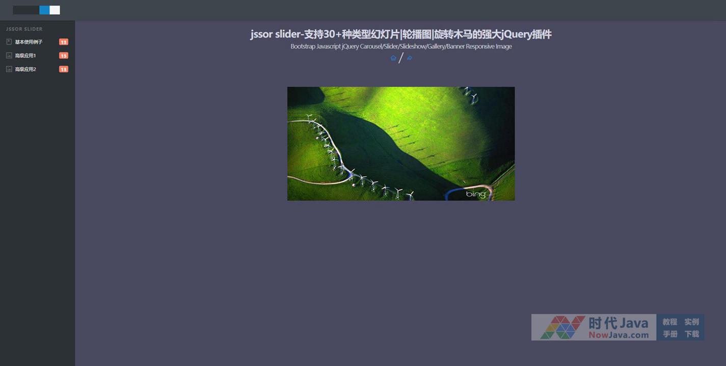 jQuery实现30+种幻灯片/轮播图/旋转木马插件jssor slider是一款功能非常强大的可制作超过30种不同类型的幻灯片|轮播图|旋转木马的jQuery插件。jssor具有高性能,轻量级,跨浏览器等特点,它可以支持IE6+的浏览器,并且可以支持移动触摸设备。