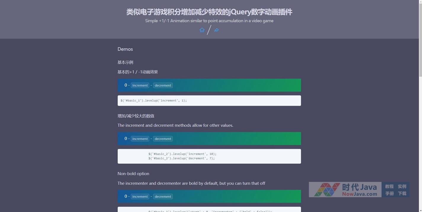 jquery-levelup是一款类似电子游戏积分增加减少特效的jQuery数字动画插件。该插件可以制作出+1/-1的数字动画,你可以控制增加或减少的数字,颜色和样式等,制作出炫酷的积分增加减少动画特效。本代码适用浏览器:搜狗、360、FireFox、Chrome、Safari、Opera、傲游、世界之窗,不支持IE8及以下浏览器。有兴趣的朋友们可以来下载试试吧。本段代码兼容目前最新的各类主流浏览器,是一款非常优秀的特效源码。希望大家可以喜欢!