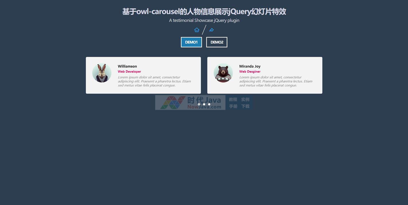 本特效是一款基于owl-carousel幻灯片插件实现人物信息展示jQuery幻灯片效果的代码。这个特效中有2个DEMO,它们通过Bootstrap的网格系统来布局,制作无限循环的人物自动展示效果。