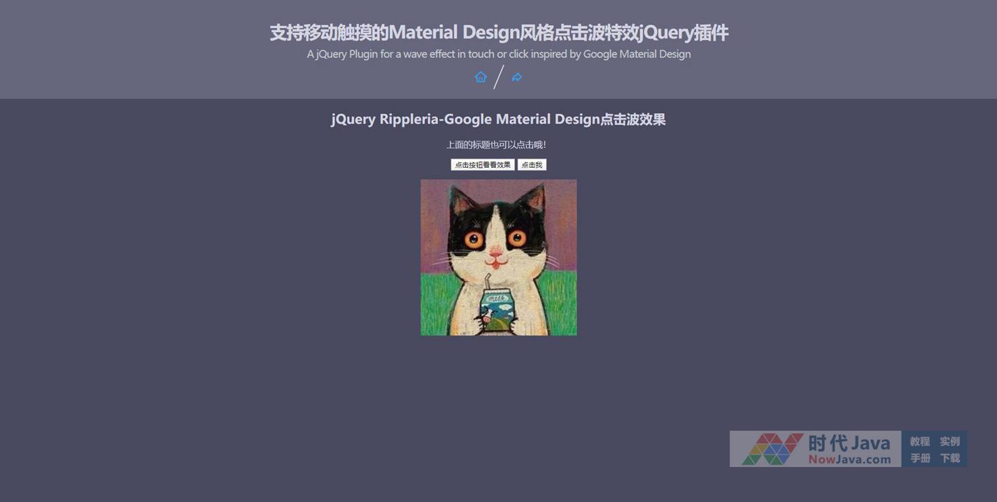 jQuery实现Material Design风格点击波特效源码是一款可以在移动触摸设备和桌面设备上使用的Material Design风格点击波特效jQuery插件rippleria的代码。它支持按钮、图片,甚至是其它HTML标签,如H1标题等的点击波效果。本代码适用浏览器:搜狗、360、FireFox、Chrome、Safari、Opera、傲游、世界之窗. 不支持IE8及以下浏览器。有兴趣的朋友们可以来下载试试吧。本段代码兼容目前最新的各类主流浏览器,是一款非常优秀的特效源码。希望大家可以喜欢!