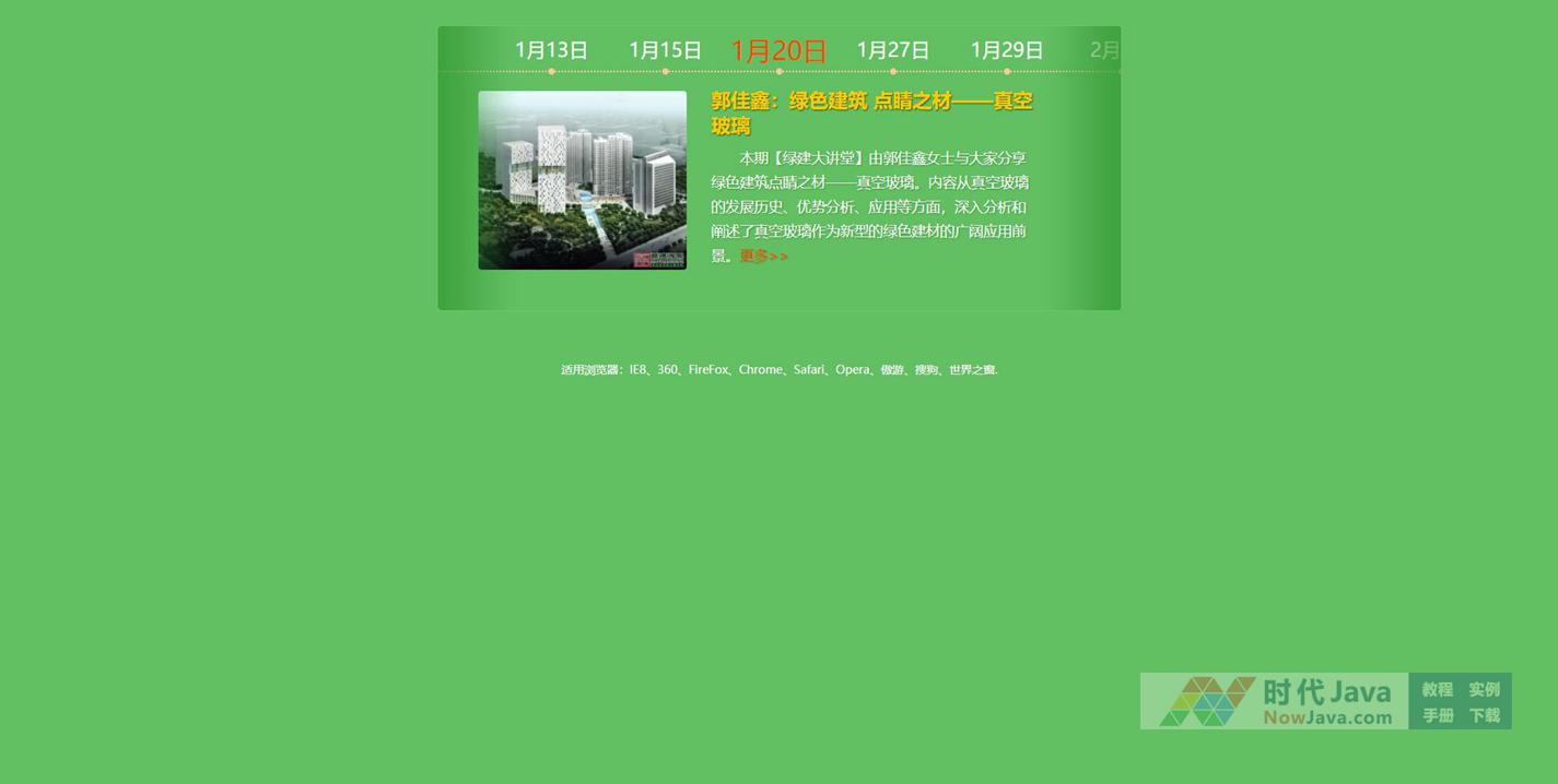 是一款绿色的点击日期可以左右切换的代码。本段代码适应于所有网页使用,有兴趣的朋友们可以来下载试试吧。本段代码兼容目前最新的各类主流浏览器,是一款非常优秀的特效源码。希望大家可以喜欢!