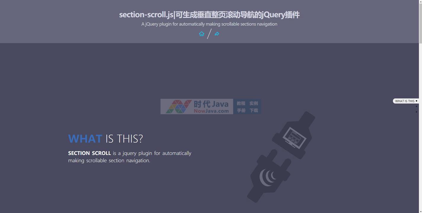 jQuery实现垂直整页滚动导航的特效源码是一款可以自动生成垂直整页滚动导航的jQuery插件section-scroll.js的代码。通过点击圆点导航按钮可以在各个section之间平滑的滚动。该插件使用简单,非常实用。