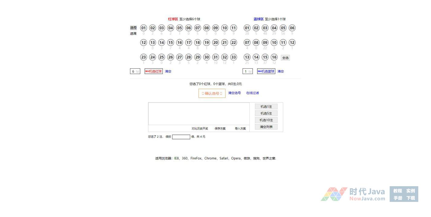 jQuery彩票双色球随机选号特效源码是一款支持随机选号,自由选号,更改,清除等彩票选号系统代码。本段代码可以在各个网页使用,有需要的朋友可以直接下载使用,本段代码兼容目前最新的各类主流浏览器,是一款非常优秀的特效源码!