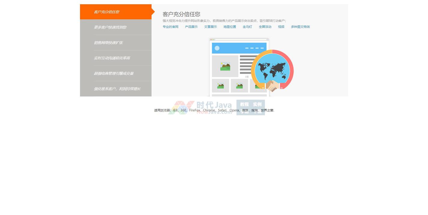 jQuery鼠标滑过选项卡切换网页内容特效源码是一款橙色的选项卡切换样式代码。本段特效源码可以在各大网站使用,有需要的朋友直接下载使用,本段源码兼容目前最新的各类主流浏览器,是一款非常优秀的特效源码,希望对大家有所帮助,有问题及时跟我留言!
