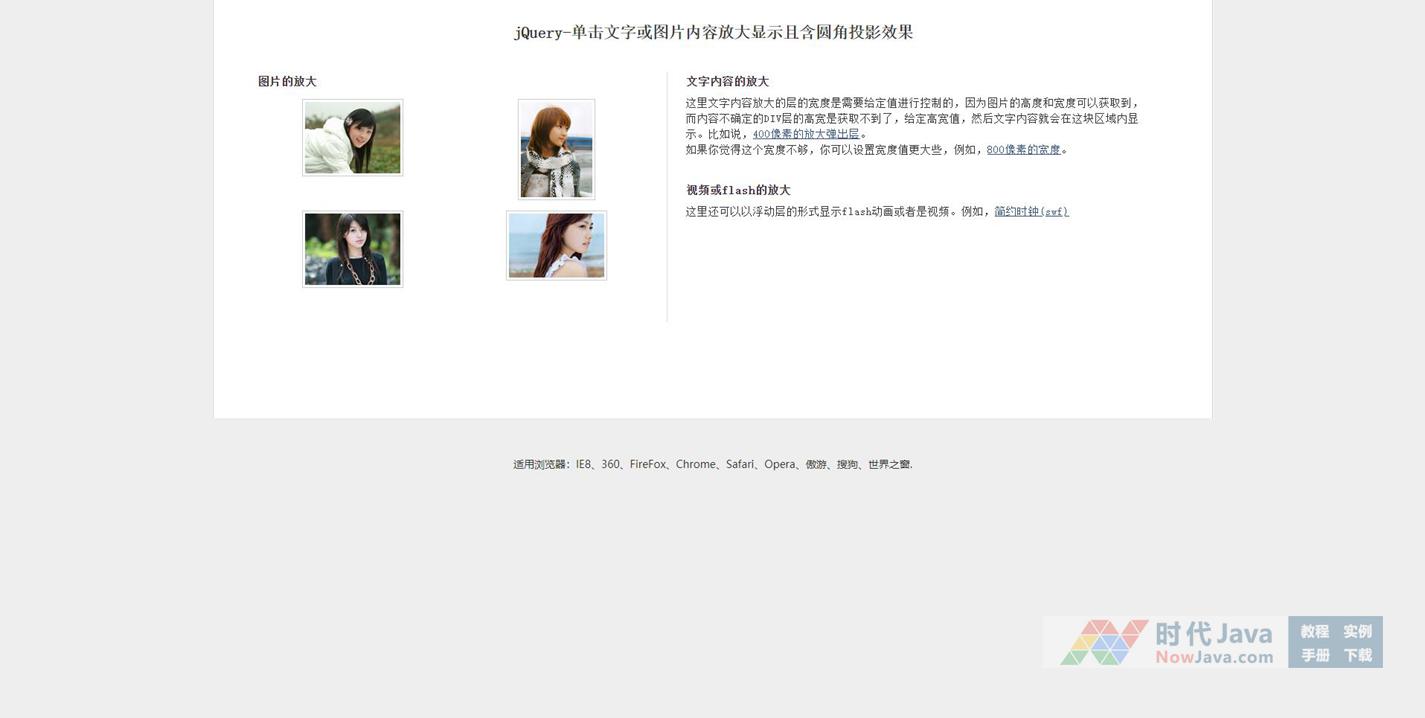 jQuery实现的弹出层图片动画查看特效源码是一段点击图片后会显示动画放大图片,鼠标单击文字或图片内容放大显示且含圆角投影的效果代码,本段代码适应于所有网页使用,有兴趣的朋友们可以了解下。本段代码兼容目前最新的各类主流浏览器,是一款非常优秀的特效源码。