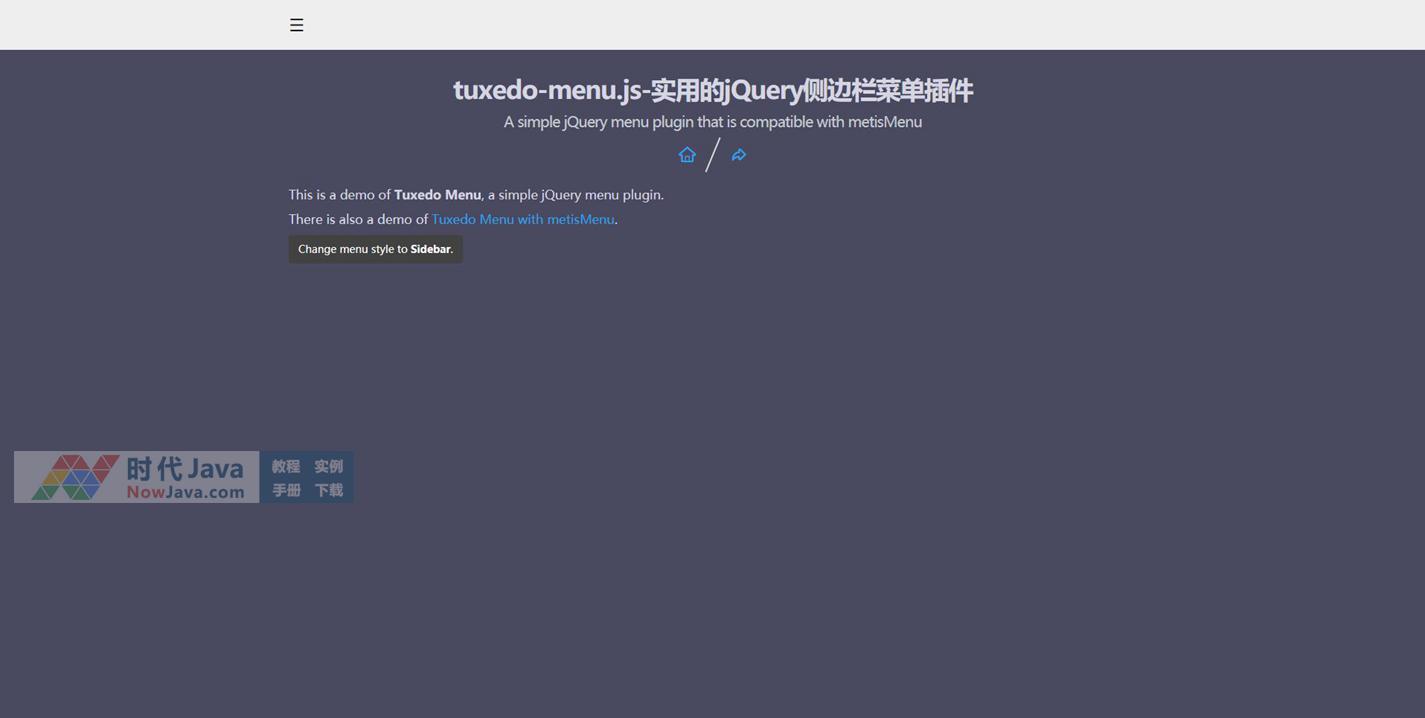 本代码是一款实用的jQuery侧边栏菜单插件tuxedo-menu.js源码。它通过animate.css来制作隐藏侧边栏的滑动效果,并且还可以和metisMenu一起结合使用。本代码适用浏览器:搜狗、360、FireFox、Chrome、Safari、Opera、傲游、世界之窗. 不支持IE8及以下浏览器。有兴趣的朋友们可以来下载试试吧。本段代码兼容目前最新的各类主流浏览器,是一款非常优秀的特效源码。希望大家可以喜欢!