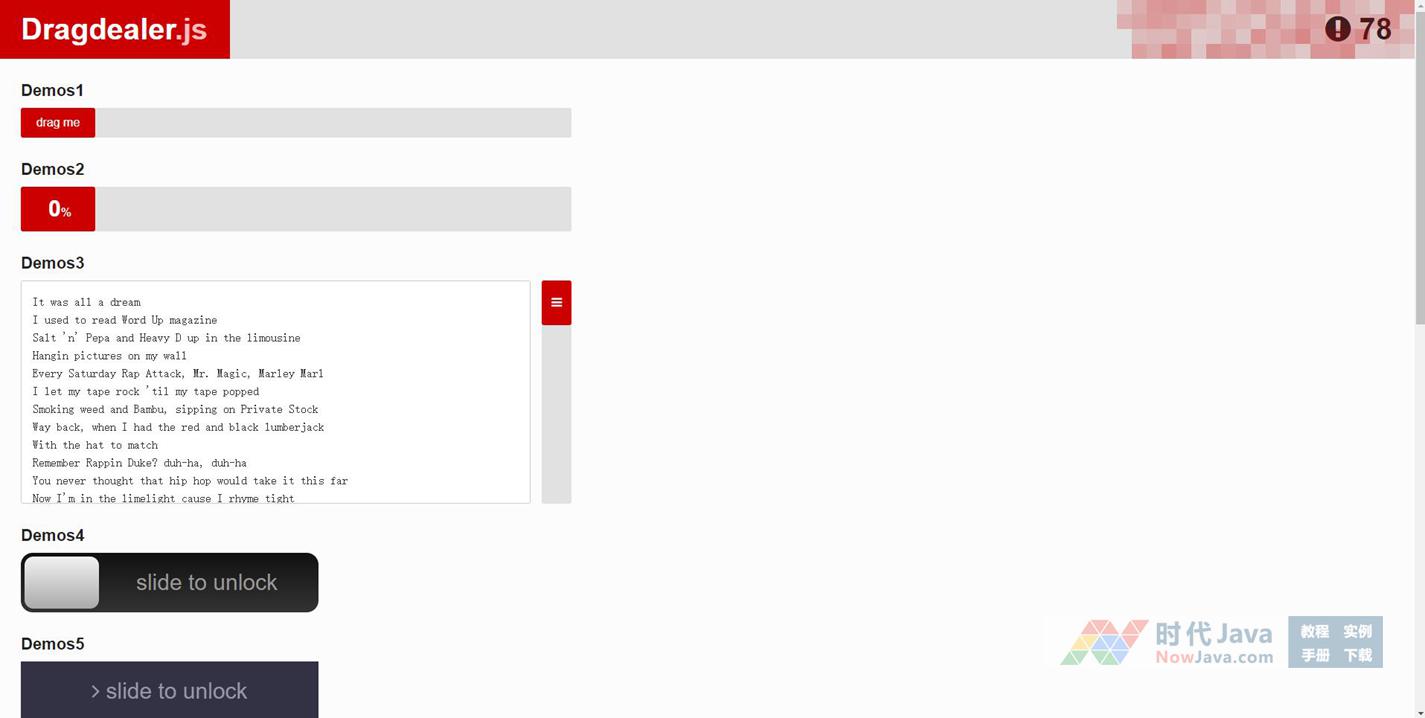 jQuery内容滚动条拖拽滑动解锁特效源码是一款可扩展出内容滚动条,滑动解锁特效,触摸轮播图等。本段代码适应于所有网页使用,有需要的朋友们可以前来下载使用。本段代码兼容目前最新的各类主流浏览器,是一款非常优秀的特效源码!