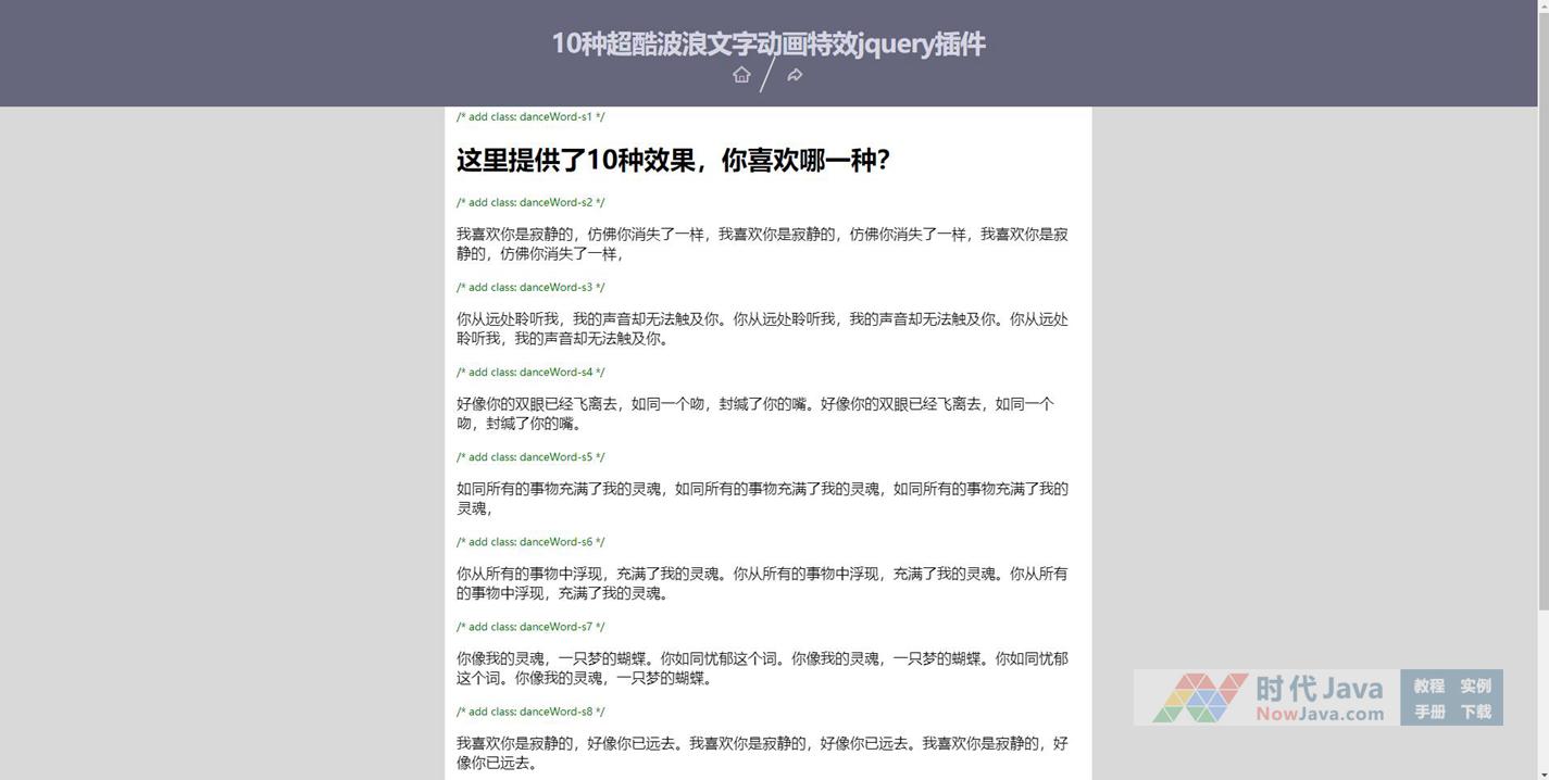 这是一款超酷波浪文字动画特效jquery插件。该波浪文字动画插件中提供了10种不同的动画特效,它使用简单,效果非常的炫酷。本段代码兼容目前最新的各类主流浏览器,适用浏览器:搜狗、360、FireFox、Chrome、Safari、Opera、傲游、世界之窗,不支持IE8及以下浏览器,首选火狐浏览器。是一款不错的的特效插件,有兴趣的朋友们可以来下载试试,希望大家喜欢!