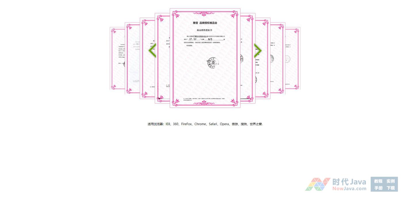 jQuery实现的唯品会授权书展示幻灯片效果源码是一段实现了带左右箭头的平滑旋转图片叠加切换的唯品会授权书展示幻灯片效果的代码,本段代码大家换个图片后就可以适应于所有网页使用了,有兴趣的朋友们可以前来下载使用。本段代码兼容目前最新的各类主流浏览器,是一款非常优秀的特效源码。