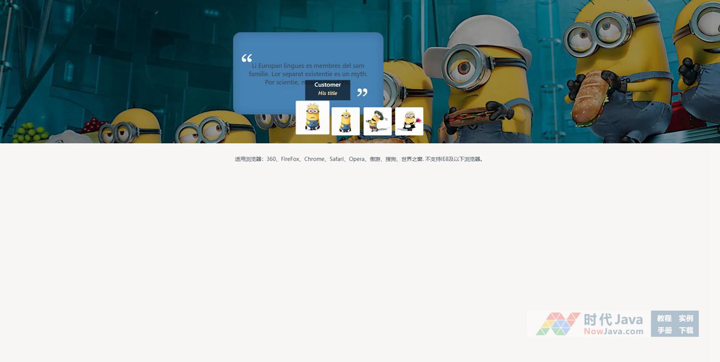 是一款两种方式jQuery小黄人人物信息介绍展示代码。本段代码适应于所有网页使用,有兴趣的朋友们可以来下载试试吧。本段代码兼容目前最新的各类主流浏览器,是一款非常优秀的特效源码。希望大家可以喜欢!