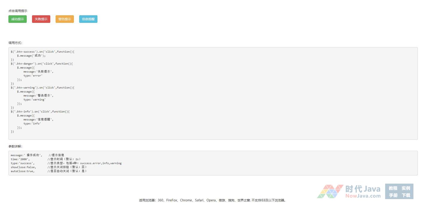 jQuery实现的消息提示框插件点击调用特效源码是一段实现了点击按钮即可调用相应消息提示框的效果代码,设置4种提示框样式,如:成功提示,失败提示,警告提示及信息提醒,文字是可以改变的,所以该段代码可以适应于所有网页使用,欢迎有需要此款源码的朋友们前来下载使用。本段代码兼容目前最新的各类主流浏览器,是一款非常优秀的特效源码。