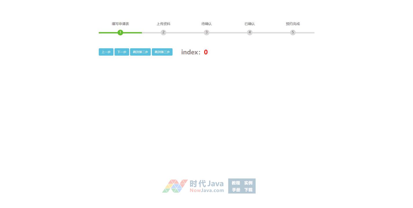jQuery实现的预约步骤分步进度条特效源码基于jquery.1.10.2.min.js制作,拥有填写预约表单步骤分步,有填写申请表、上传资料、待确认、已确认、预约完成等预约步骤内容,有上一步、下一步、跳到第二步、跳到第三步等按钮链接本段代码,兼容目前最新的各类主流浏览器,是一款非常优秀的特效源码。