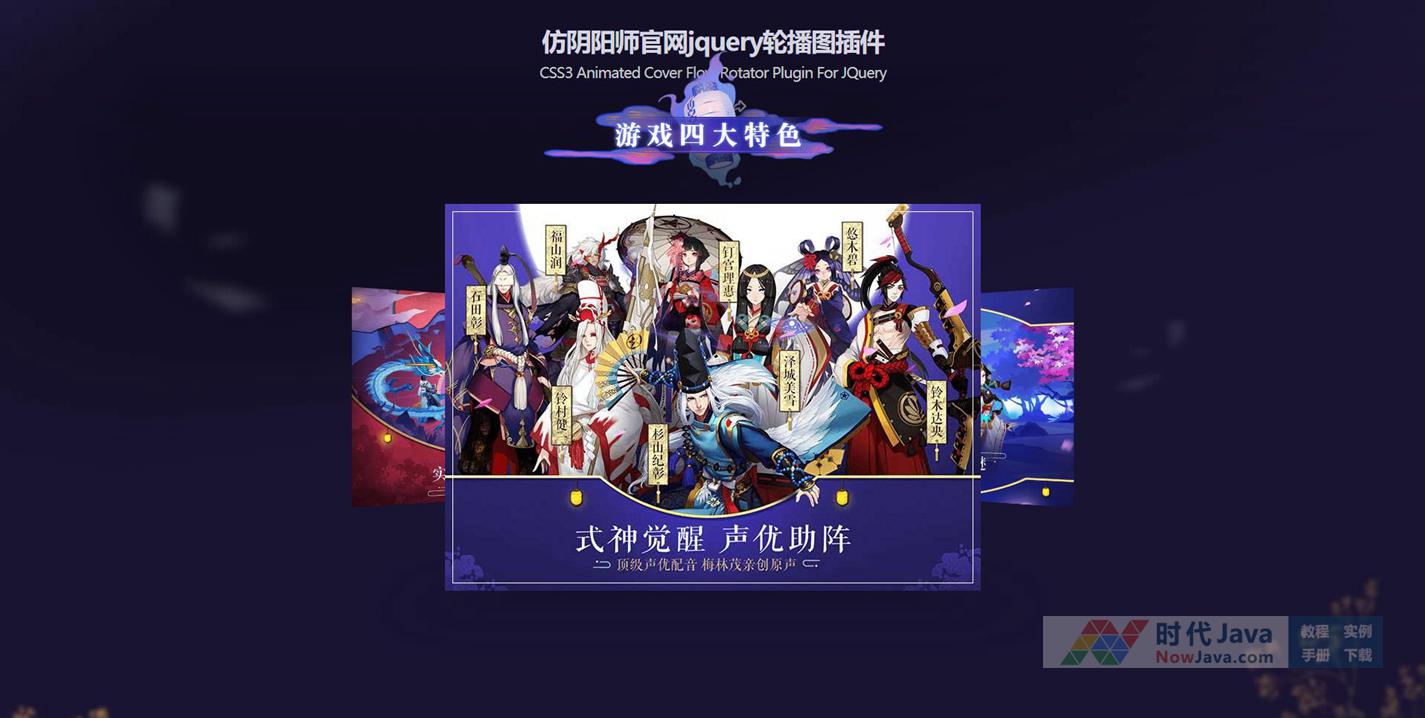 这是一款高仿阴阳师官网的jquery轮播图插件。该轮播图为无限轮播插件,轮播方式为横向滚动(仅支持此方式)。由于本插件使用了大量CSS3属性,对于低版本浏览器(如ie9以下版本等不支持CSS3属性的浏览器)不兼容。