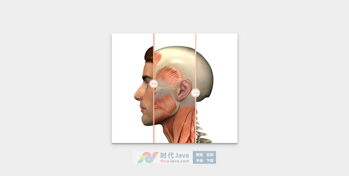 这是一款基于js实现的滑块拖动3层图片对比效果源码。界面上有2个左右拖动滑块,通过拖动滑块可控制界面上的3层图片切换,产生相邻图片的对比显示效果。用户可看到人体头部的外观、肌肉、骨骼的对比显示特效。建议使用支持HTML5与css3效果较好的火狐(Firefox)或谷歌(Chrome)等浏览器预览本源码。