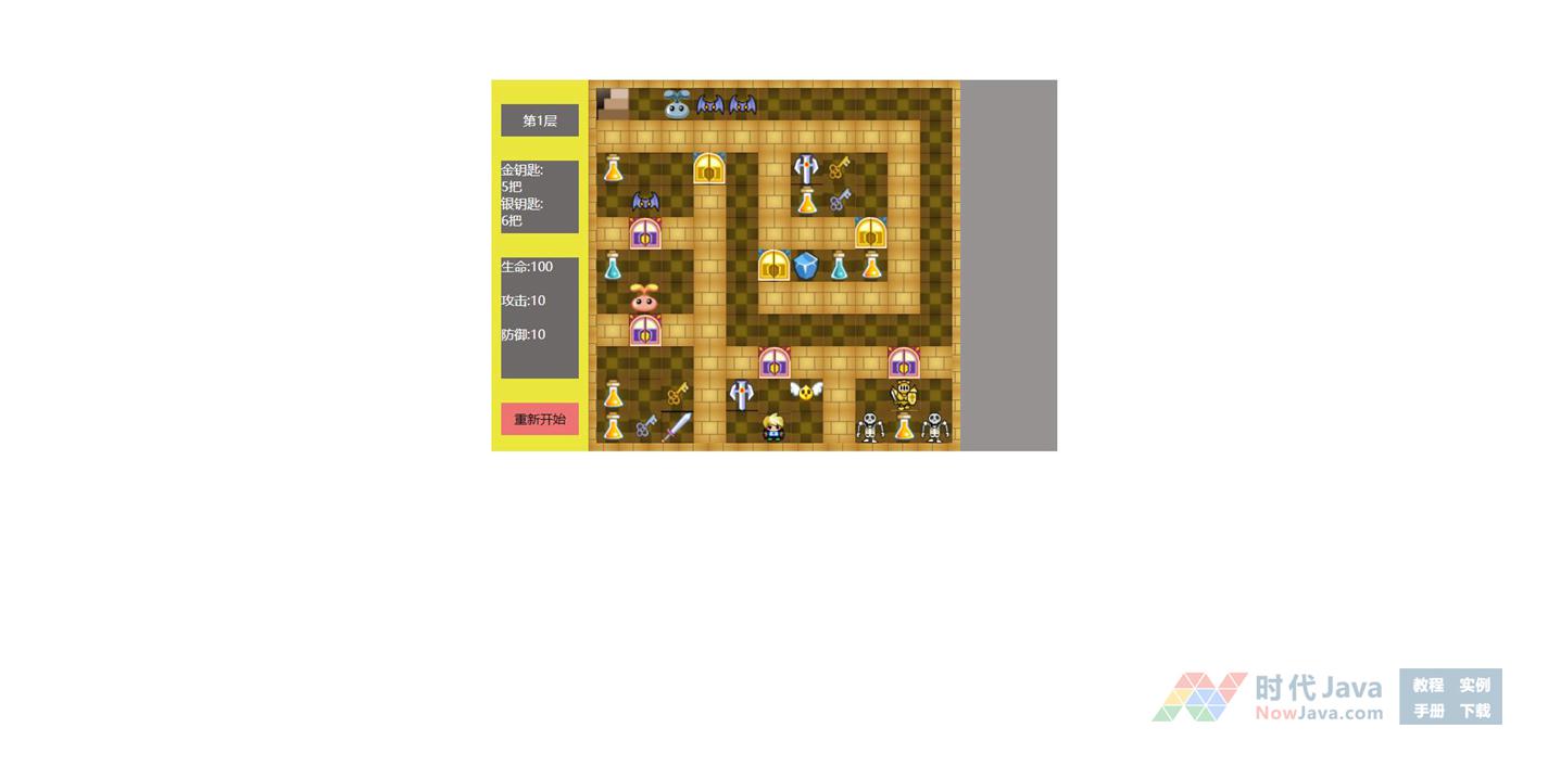 这是一款基于js实现的魔塔闯关类小游戏源码。玩家通过键盘方向键控制游戏中人物的上下左右移动,使游戏中的人物角色打开房间,获取钥匙、药水、宝剑、盾牌等道具。最终跨过各种障碍进入下一关的门里面。左侧面板还记录了角色的关卡、道具、生命值等参数。建议使用支持HTML5与css3效果较好的火狐(Firefox)或谷歌(Chrome)等浏览器预览本源码。