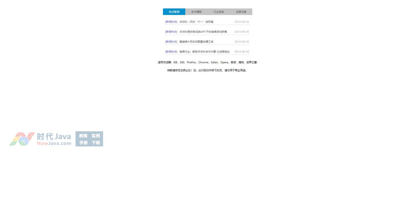 这是一款基于js实现的原生态tab新闻列表切换选项卡效果源码,鼠标滑过选项可实现对应列表的切换显示,效果流畅自然,是一款非常优秀的特效源码。该源码兼容目前最新的各类主流浏览器。